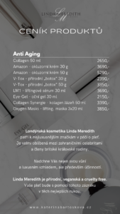 Linda Meredith patří mezi TOP luxusní značky v kosmetice na celém světě. Neuvidíte ji sice tak často v časopisech, ani ji nekoupíte v řetězových prodejnách. Raději než do marketingu investuje do vývoje a udržuje si svou vysokou kvalitu, nikoliv kvantitu. Zůstává tak dostupná nejen pro vybranou klientelu, ale i pro nás běžné ženy. Rovná se účinností a složením hrstce těch nejdražších a nejkvalitnějších značek, které kosmetický průmysl nabízí. Je to značka velmi oblíbená mezi zahraničními celebritami a členy královské rodiny. Nadchne Vás svou vůní esenciálních olejů a luxusním vzhledem. Je přírodní, veganská a cruelty free. Vaše pleť bude s pomocí tohoto zázraku v těch nejlepších rukou.